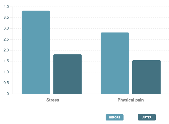 The study provides insight into the effectiveness of VIZR™ in relation to stress and physical pain. It compares the mean score before and after the VIZR™ session. The study documents the improvement of feelings and experiences through the subjective perception and sharing of the people under observation. After a session with the VIZR™, subjects felt almost half as much stress and physical pain.